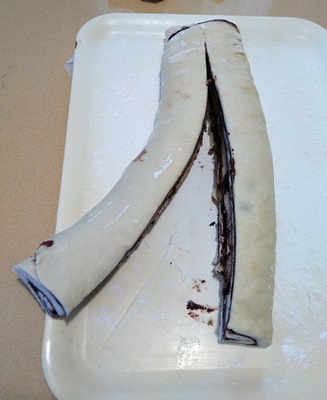 Intrecciate le due braccia del filoncino avendo sempre cura di tenere in alto la farcitura al cioccolato.