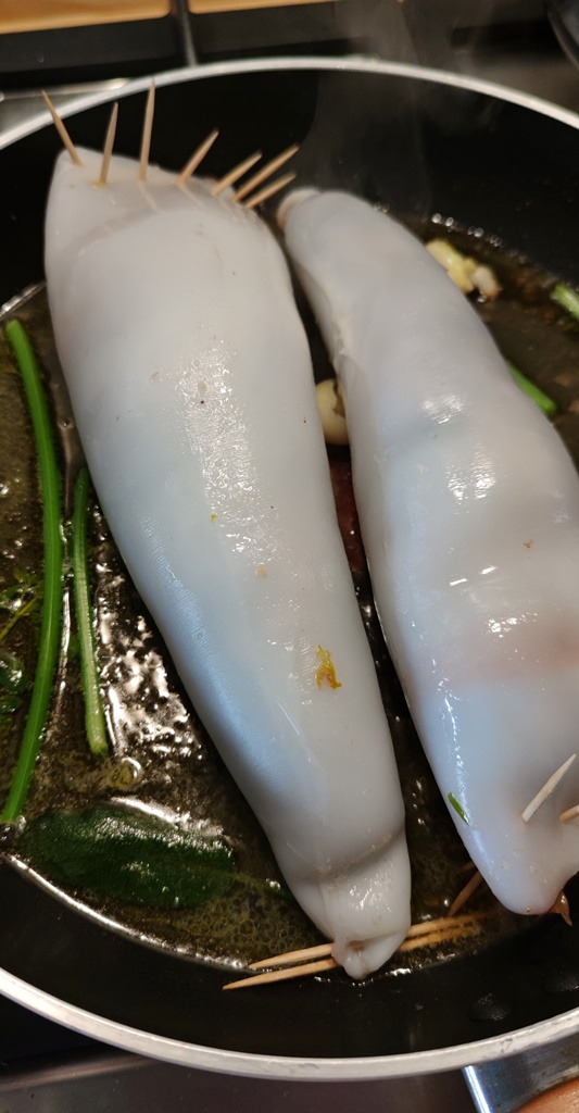 Quando l'aglio sarà dorato lo eliminate e aggiungente i calamari.