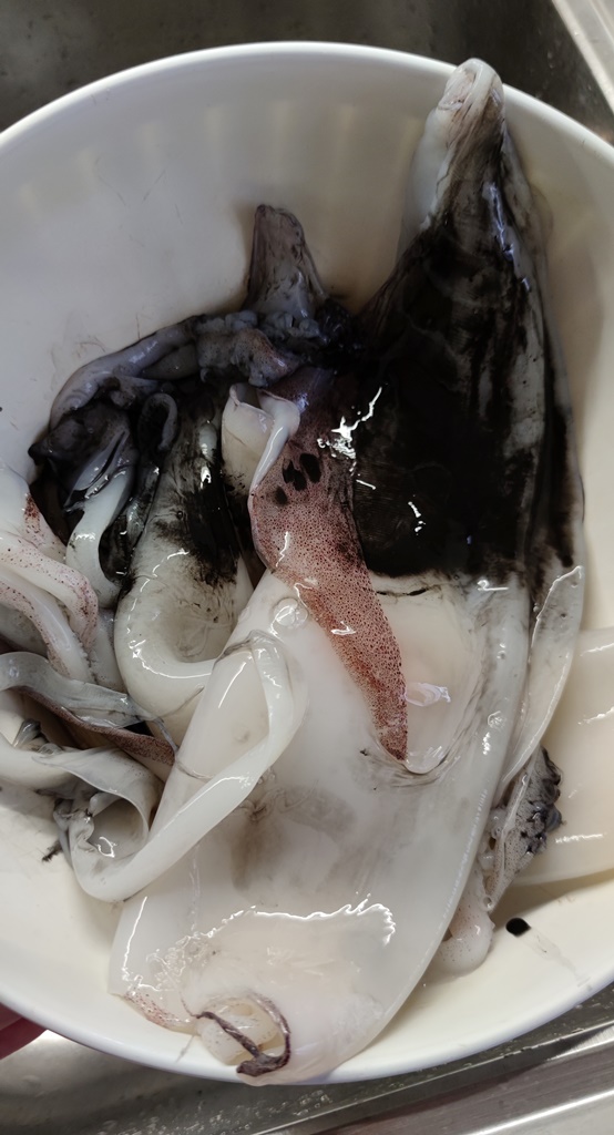 Tenete da parte le scarole e lavate anche i calamari già puliti internamente. Abbiate cura di tagliare anche le alette posteriori e di tirare via tutta la pelle.