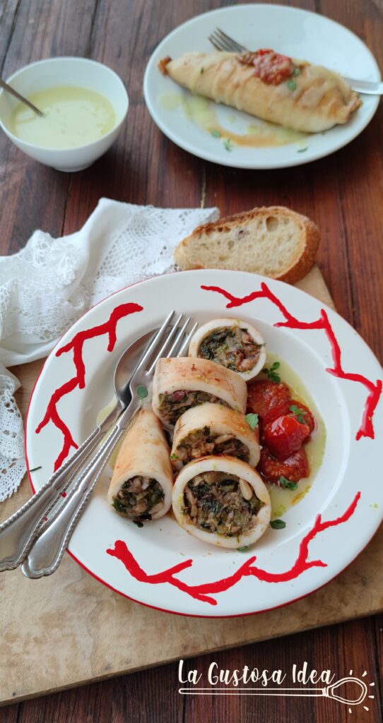 I calamari ripieni di scarole sono un secondo piatti di mare squisito e perfetto da portare in tavola quando avete ospiti. Qualche tempo fa ho mangiato, in uno dei ristorantini alle pendici di Monte di Procida, la minestra maritata di mare, con scarole e calamari. Mi era piaciuta tantissimo e mi sono sempre detta che, prima o poi, l’avrei rifatta. L’abbinamento mi era particolarmente piaciuto ma, è solo dopo aver letto le ricette presenti nel libro “Procida – Gente, Culture e Cucina, che mi sono decisa a provare. La ricetta da cui sono partita è dello Chef Carlo Ascione che propone, al contrario della minestra, il calamaro di lenza ripieno di scarole e provola alla partenopea. Ho comprato quindi dei bei calamari freschi da Salatiello, la mia pescheria di fiducia dove, mi basta scegliere e loro puliscono perfettamente tutti i pesci che mi occorrono. Ho poi cambiato qualcosa nell’esecuzione della ricetta e degli ingredienti, così da dare un mio tocco personale alla ricetta anche perché, per scoprire la ricetta originale e tante altre cose fantastiche su Procida, prima di visitarla di persona, potete acquistare e regalare il libro edito da Anna Russolillo di Villaggio Letterario e curato anche da Rosario Mattera di Malazè. I calamari ripieni di scarole sono perfetti anche da proporre per la cena della Vigilia, a casa mia li hanno già prenotati 😉