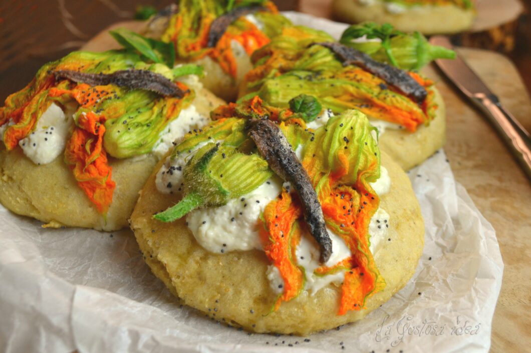 Cuocete le focaccine in forno statico già caldo a 180° C per circa 15 minuti, dopodiché farcite ogni focaccina con la crema di ricotta, fiori di zucca, un'acciughina e semi di papavero.