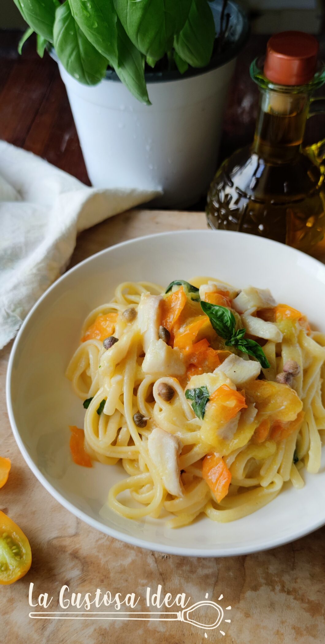 Le linguine baccalà e pomodori gialli sono un primo piatto decisamente squisito, facile da preparare per stupire la vostra famiglia o i vostri ospiti. Ho cercato una combinazione facile e saporita, e con il baccalà, i capperi e i pomodori gialli, si vince facile. Con questo sughetto super delizioso e intrigante, ho voluto condire le LINGUINE LE GEMME DEL VESUVIO SRL del Pastificio Grania Srl . Mi piace sentire il profumo della semola rimacinata e mi piace proprio il formato di pasta, creato su misura per essere avvolto da sughetti corposi. Durante la cottura della pasta e del sugo, io non ho aggiunto troppo sale. Abbiamo baccalà e capperi che, anche se dissalati, sono comunque saporiti.. Voi regolatevi ma io vi consiglio di non eccedere.