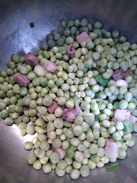 Aggiungete i piselli e fate insaporire. Poi aggiungete un po' di acqua calda (messa a bollire in precedenza a parte) fino a coprire i piselli, sempre poca alla volta.