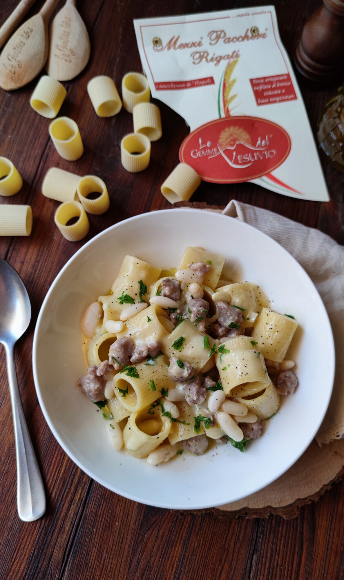 Una volta cotti i Mezzi Paccheri Rigati, scolateli nella padella con la salsiccia e unite, poco alla volta, la crema di fagioli cannellini.