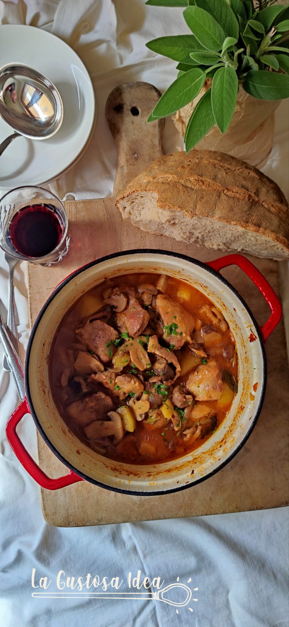Trascorso il tempo necessario unite i funghi al tegame con lo spezzatino di maiale e fate insaporire tutti gli ingredienti insieme.