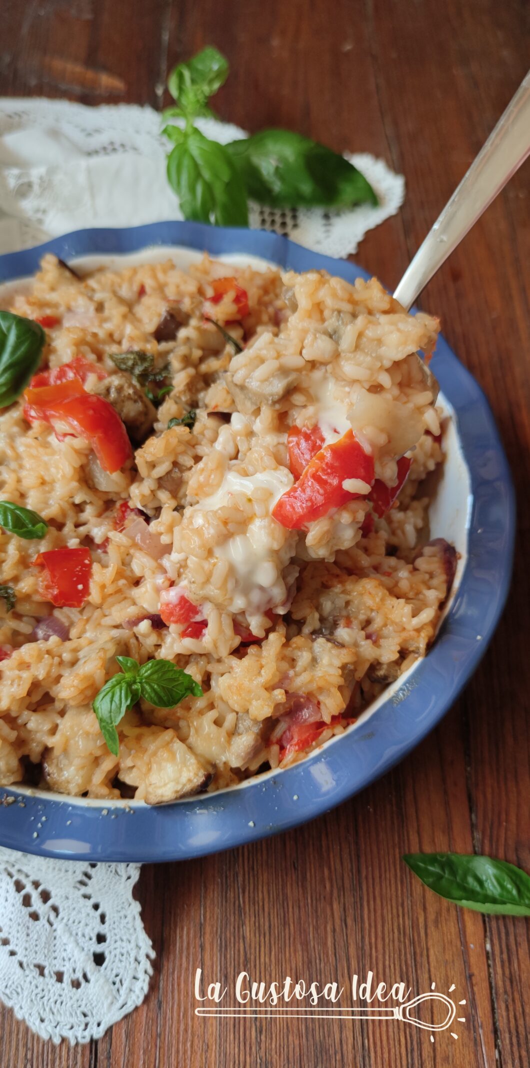Il riso al forno con melanzane è un primo piatto unico vegetariano, saporito e facile da portare in tavola. Questa è una ricetta adatta per il pranzo ma, preparata in anticipo, è perfetta anche per la cena. Io ho utilizzato melanzane, cipolla rossa e pomodorini ma, se gradite, nulla vi vieta di aggiungere i vostri ortaggi preferiti. Ho reso il tutto più goloso con un mix di formaggi e tanto tanto basilico. Spero che questa ricetta incontri il vostro gusto!