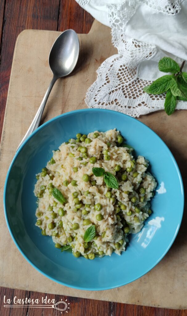 Servite il riso e piselli ben caldo, profumando il tutto con delle foglioline di menta.
